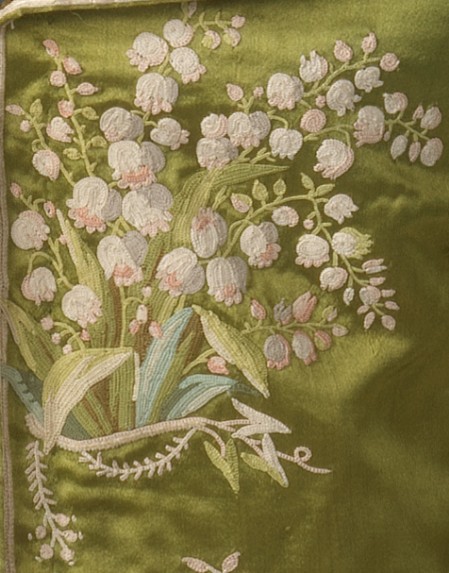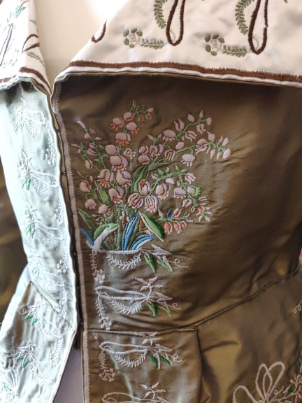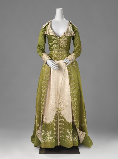 Kleid oder 'redingote' aus moosgrüner und zartrosa Seide, bestehend aus einem Kleid mit offenem Rock (a) und einem Rock (b), der mit Maiglöckchen bestickt ist. Dieses Kleid wurde von Louise Six (1862-1934) am 18. Oktober 1881 bei einem Festakt anlässlich der Silberhochzeit ihres Onkels und ihrer Tante Six-Teding van Berkhout getragen. Das Kleid stammte höchstwahrscheinlich aus der Familie von Louises Mutter, d'Ablaing van Giessenburg. In der Sammlung Six (inv. Six 50835, bnd. 31) gibt es eine Fotografie der Tafeln, auf der Louk (Louise) ganz links sitzt und ihre rechte Hand auf die Tasten des Klaviers legt.