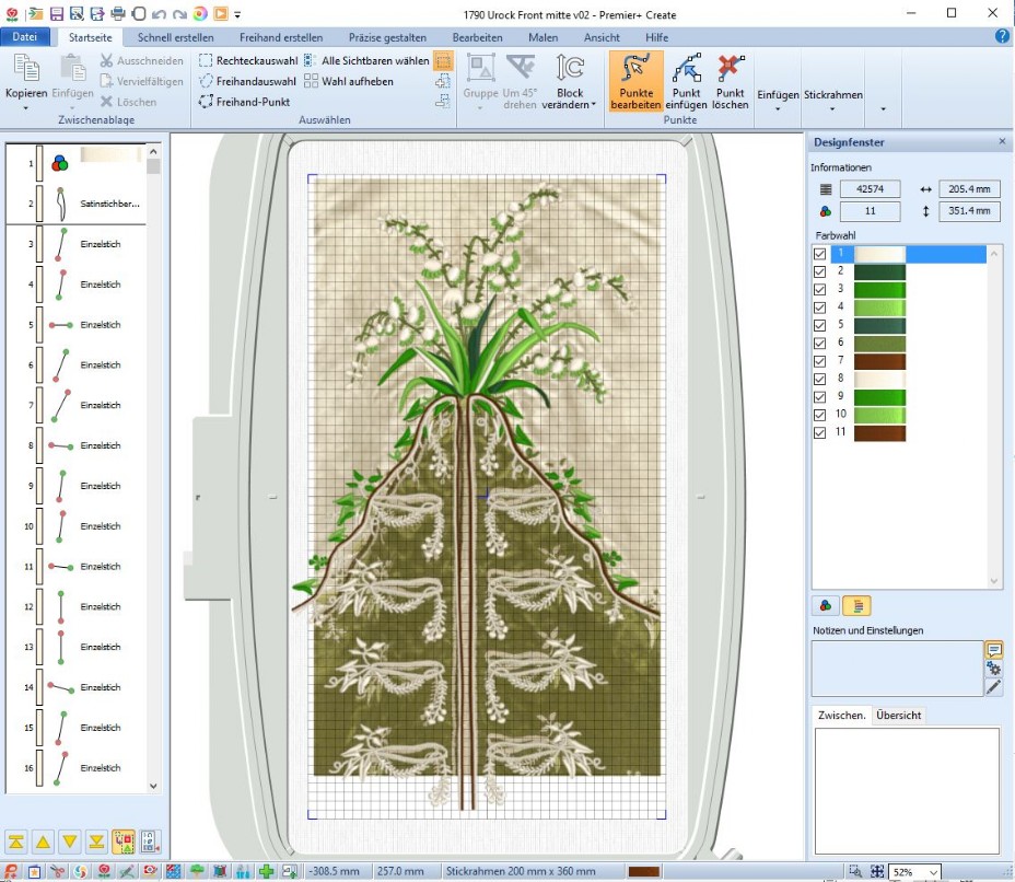 Den ermittelten Maßen entsprechend wurden aus den Bildern vom Rijksmuseum die Details vermessen und ensprechende Bildausschnitte erstellt. Diese dienten dann als Hintergrund für das Programm Premier + Create um die Stickvorlagen für meine Stickmaschine zu erstellen. Ich benutze eine Husqvarna Viking Designer Topaz 50 mit einem 360mm x 200 mm Stickrahmen.