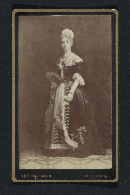 Sie trägt ein dünnes Fichu im tiefen Ausschnitt mit einer Rose in der vorderen Mitte. Auf dem streng gekämmten Haar mit Mittelscheitel sitzt eine Mütze und unter den Manschetten ein Rüschenstreifen. Am unteren Ende des Rocks befindet sich ein gerüschter Streifen aus einem durchsichtigen Material (Batist?, Gaze-de-Lisse?). Auf der Casinobal (Keizersgracht 464, A'dam) am 28. Februar 1896 trug Louk Blaauw (inzwischen verheiratet mit Frans E. Blaauw) das Kleid erneut. Die Six Collection besitzt eine Carte-de-Visite von Th. Bruggemann aus Amsterdam, der die anwesenden Gäste des Abends fotografiert hat (R.M. neg. 15209 9/12). Diesmal ist der Hals unbedeckt, aber ein großer Kragen mit Rüschen und herabhängenden Spitzen - die vorne in der Mitte auf der Brust geknotet sind - liegt über den Aufschlägen. An den Vorderseiten der Beine und auch über dem Rocksaum ist ein Rüschenstreifen angebracht. Auf dem lockigen Haar liegt ein Büschel am Hinterkopf und in der rechten Hand ein Fächer aus dem 18. Jahrhundert.